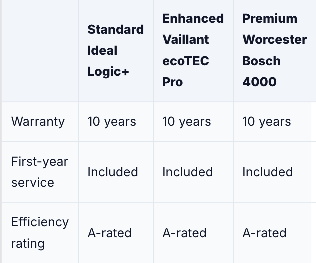 Professional fitting of Ideal, Vaillant & Worcester Bosch by Gas Safe engineers. First-year service included.