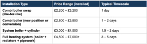 A straightforward combi boiler swap takes one day. A system boiler installation with a new cylinder takes one and a half to two days. A full heating system with new radiators and pipework takes three to five days depending on the size of the property.